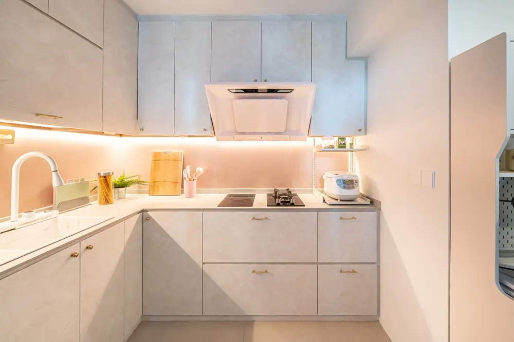 This cozy HDB kitchen demonstrates how a closed layout can still feel bright and open. This cozy HDB kitchen demonstrates how a closed layout can still feel bright and open. The light color scheme, with white walls and pale blue cabinets and countertops, helps create a sense of openness, while the thoughtful cabinet design maximizes storage without cluttering the space. Designed to be compact, functional, and easy to use, the kitchen allows homeowners to work efficiently while maintaining a refreshing and airy atmosphere.